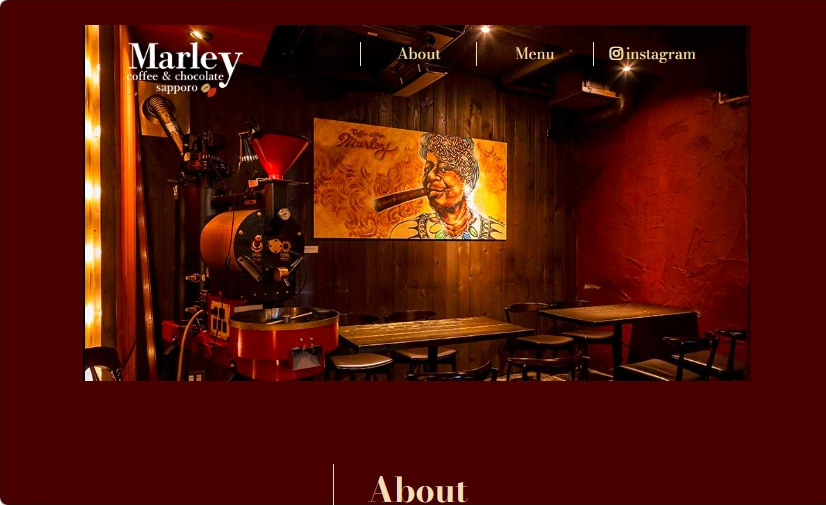 概要:すすきのにあるカフェ coffee&chocolateMarley のwebサイトを制作 デザインの意図:女性はもちろんカフェにあまり関心のない男性にも興味を持ってもらえるよう意識して制作した。coffee&chocolateMarleyは、すすきのの真ん中で深夜2時まで営業し、店内には大きなスピーカーでレコードが流れるお洒落で大人な雰囲気のお店